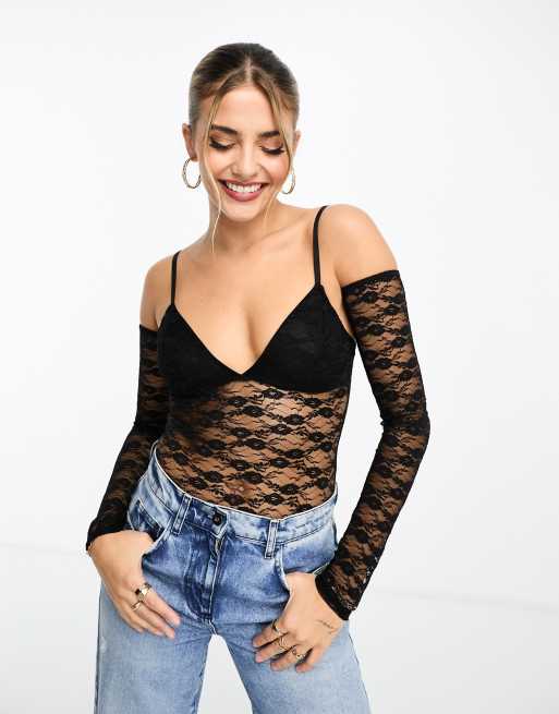 Miss Selfridge lace bodysuit with detachable sleeves in black
