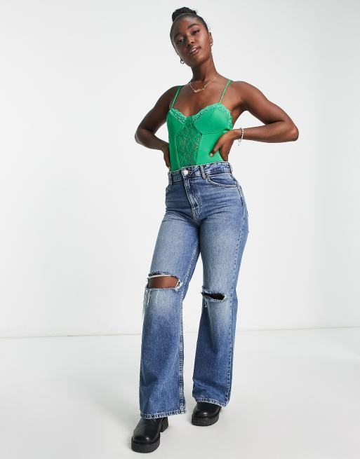 Jeans and lace clearance bodysuit, Sisters Of The Tribe satin lace detail bodysuit in green ASOS clearance