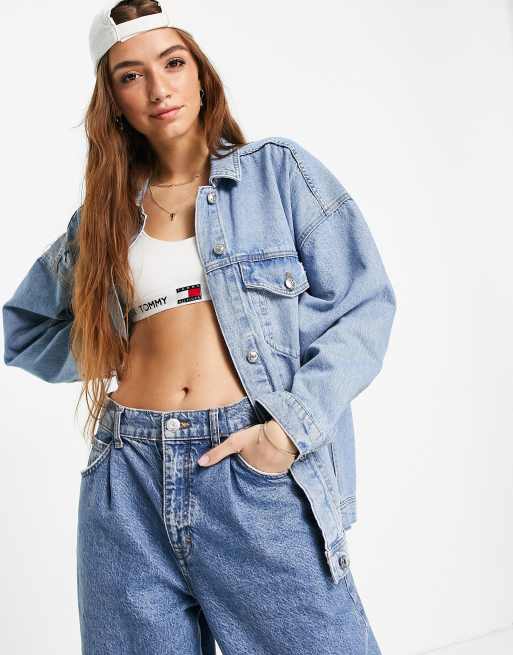 Stradivarius cotton oversized denim jacket in medium wash MBLUE