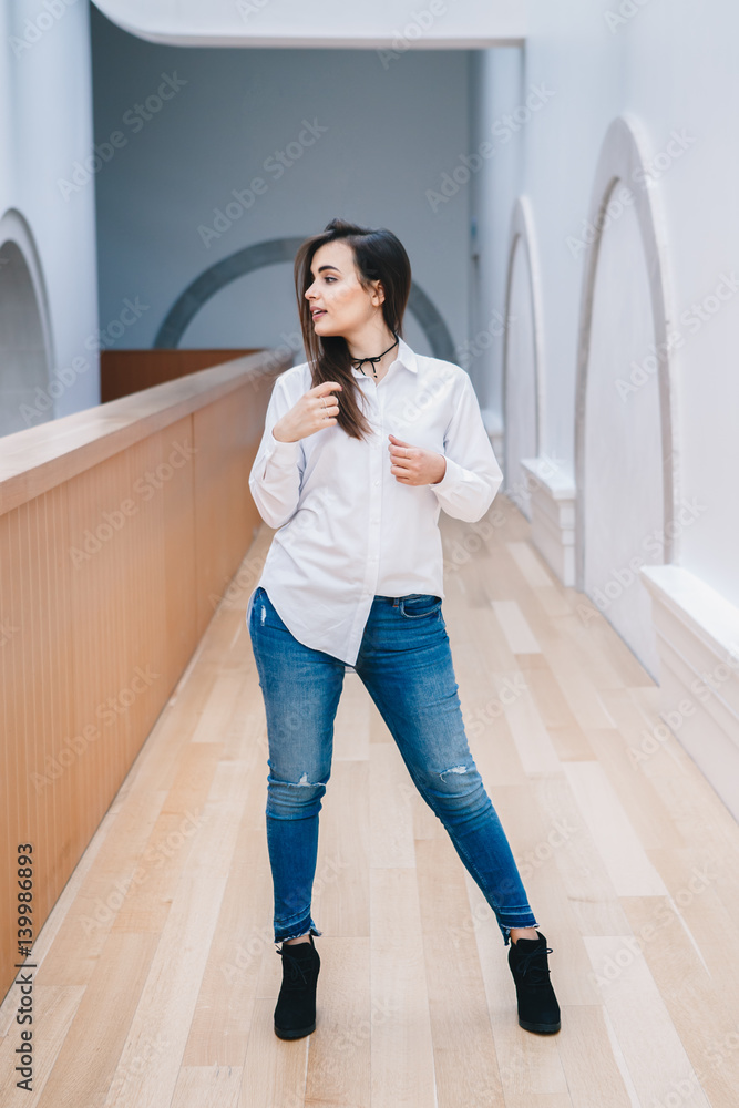 Girl white shirt clearance blue jeans, Portrait of smiling white Caucasian brunette young beautiful girl clearance