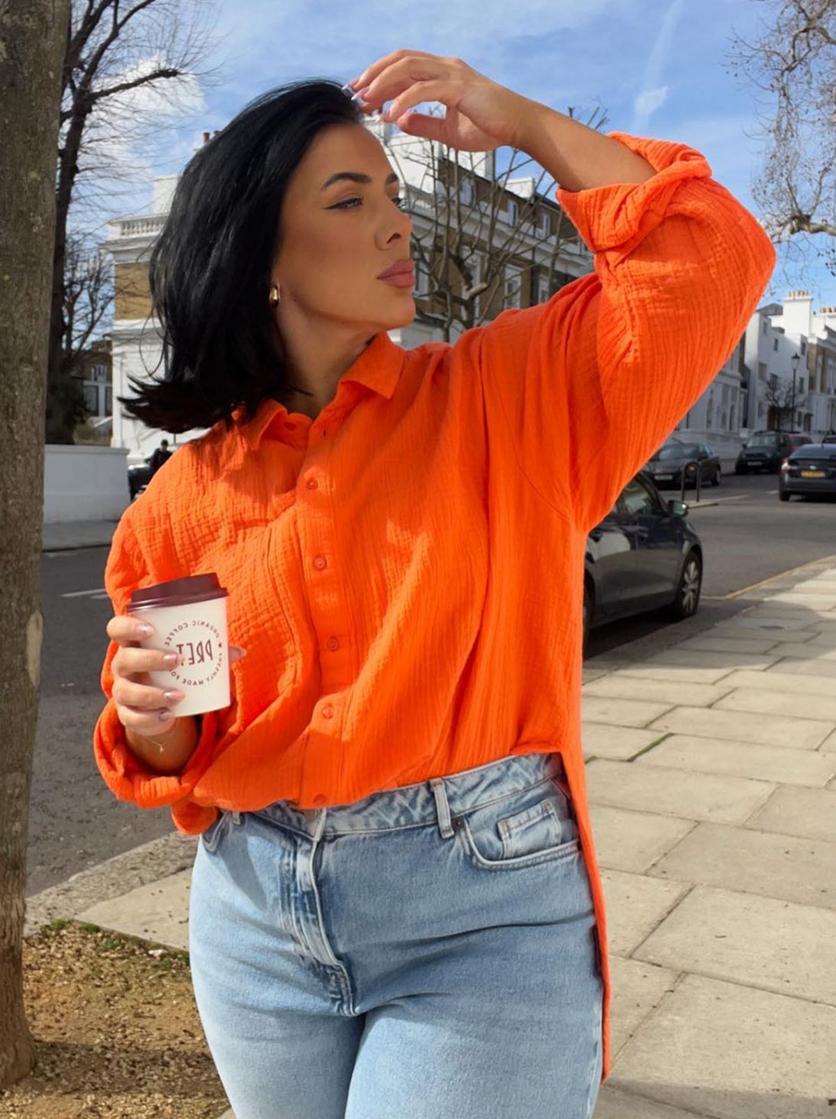Orange shirt blue jeans outfit. Orange shirt outfit. Orange