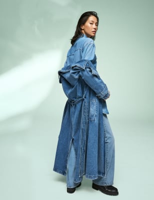 Long denim trench clearance jacket