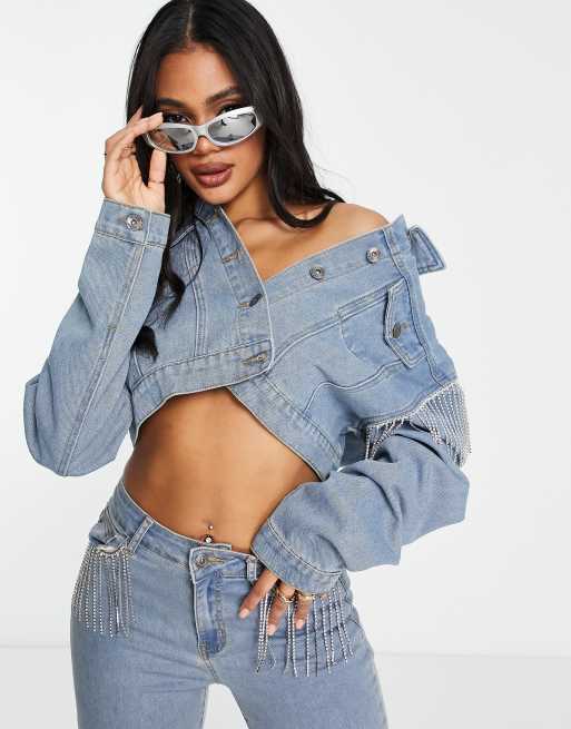 Fae cropped denim trucker jacket with diamante fringe in washed