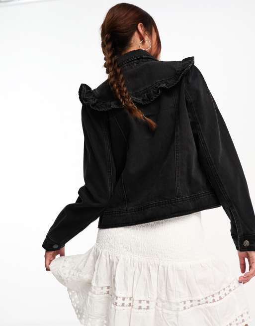 Black frill denim clearance jacket, DTT denim jacket with frill detail in black clearance