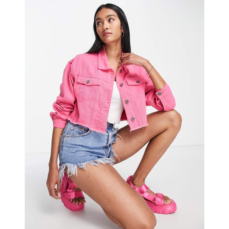 Fae boxy cropped oversized denim jacket with raw hem in bubblegum pink