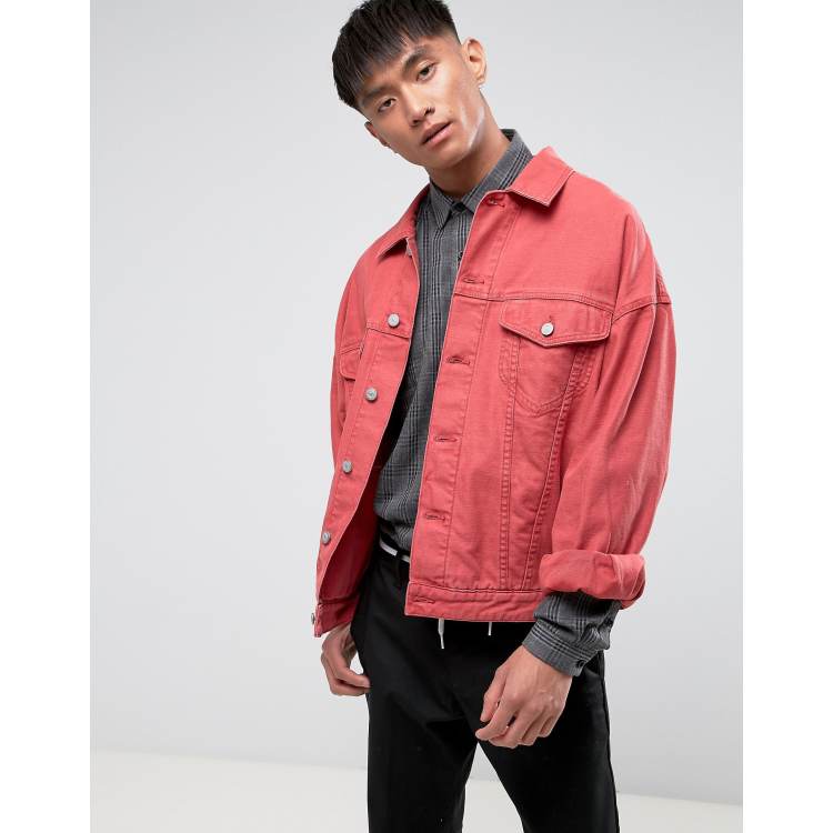 Red denim jacket clearance asos, ASOS DESIGN denim jacket in red with contrast stitch and printed sleeve clearance