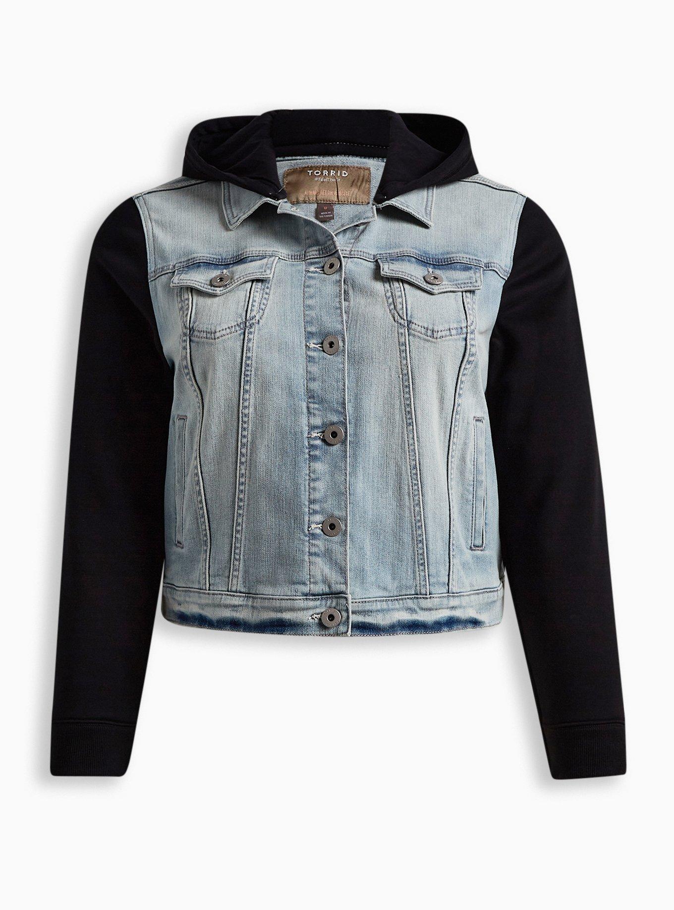Plus Size Denim Knit Sleeve Hooded Trucker Jacket Torrid