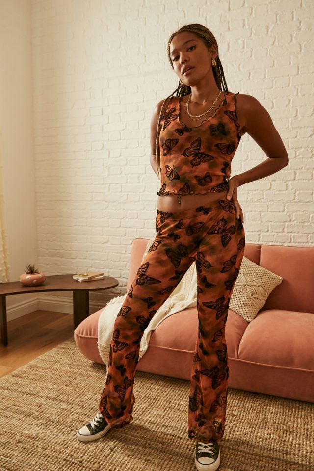 Orange clearance mesh flares, UO Georgia Mesh Flare Butterfly Pants clearance