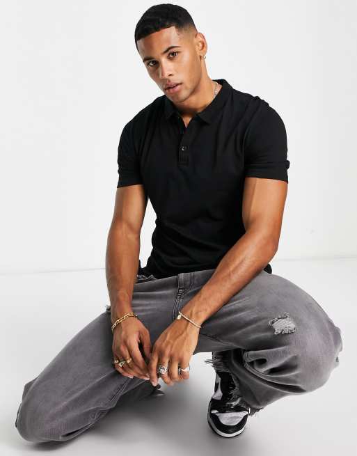 Muscle Fitted Plain Pique Polo T Shirt Black