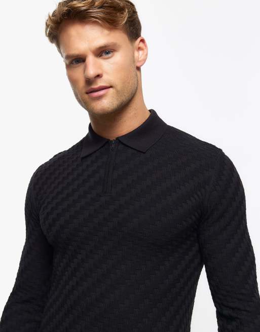 River island muscle clearance fit polo, River Island Muscle fit zig zag knit polo in black ASOS clearance