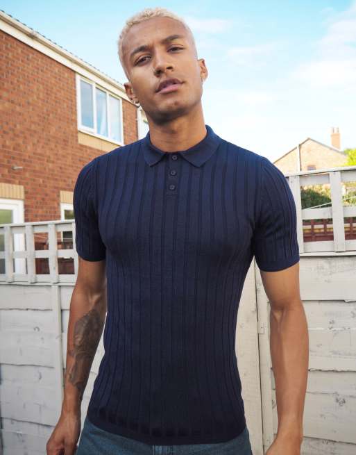 ASOS DESIGN knitted muscle fit rib polo t shirt in navy