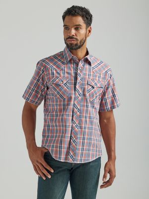 Men s Wrangler Fashion Snap Short Sleeve Western Snap Plaid Shirt in Orange