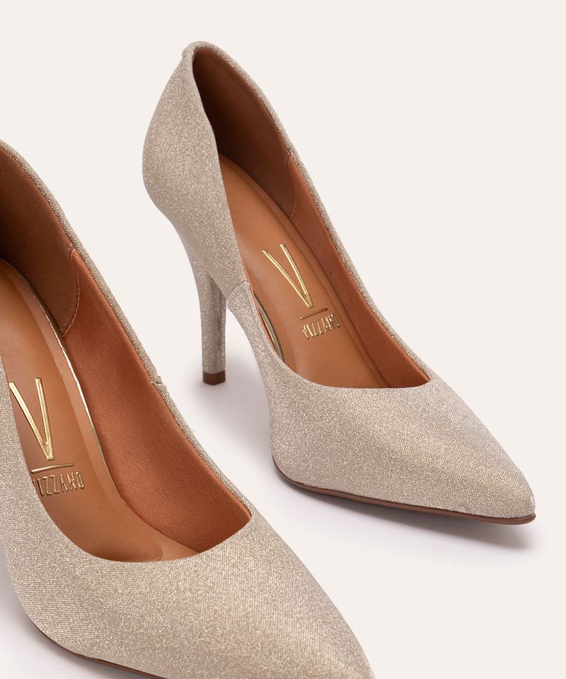 scarpin salto alto bico fino com glitter vizzano ouro C A