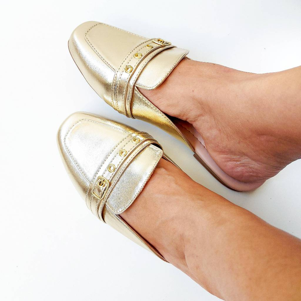 Sapato clearance mule dourado, Sapato Mule Bege Verniz Com Detalhe Dourado Divas Outros Moda clearance