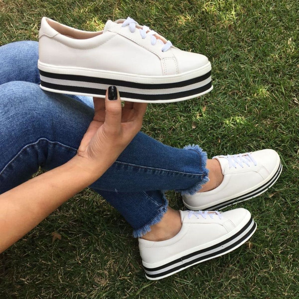 T nis branco com listras pretas. Sneakers fashion Fashion shoes