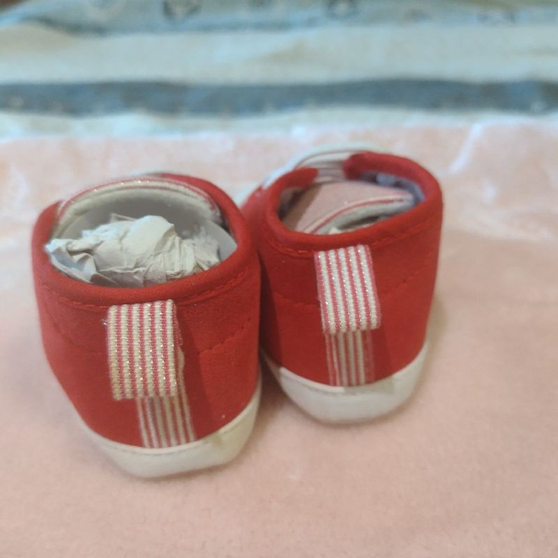 T nis Beb Vermelho com Listras. Tamanho 4 Seis e Sete Meses
