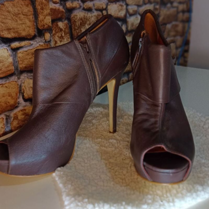Sapato Peep Toe em Couro Marrom Ruim Tamanho 38 Meia Pata 3 Cm