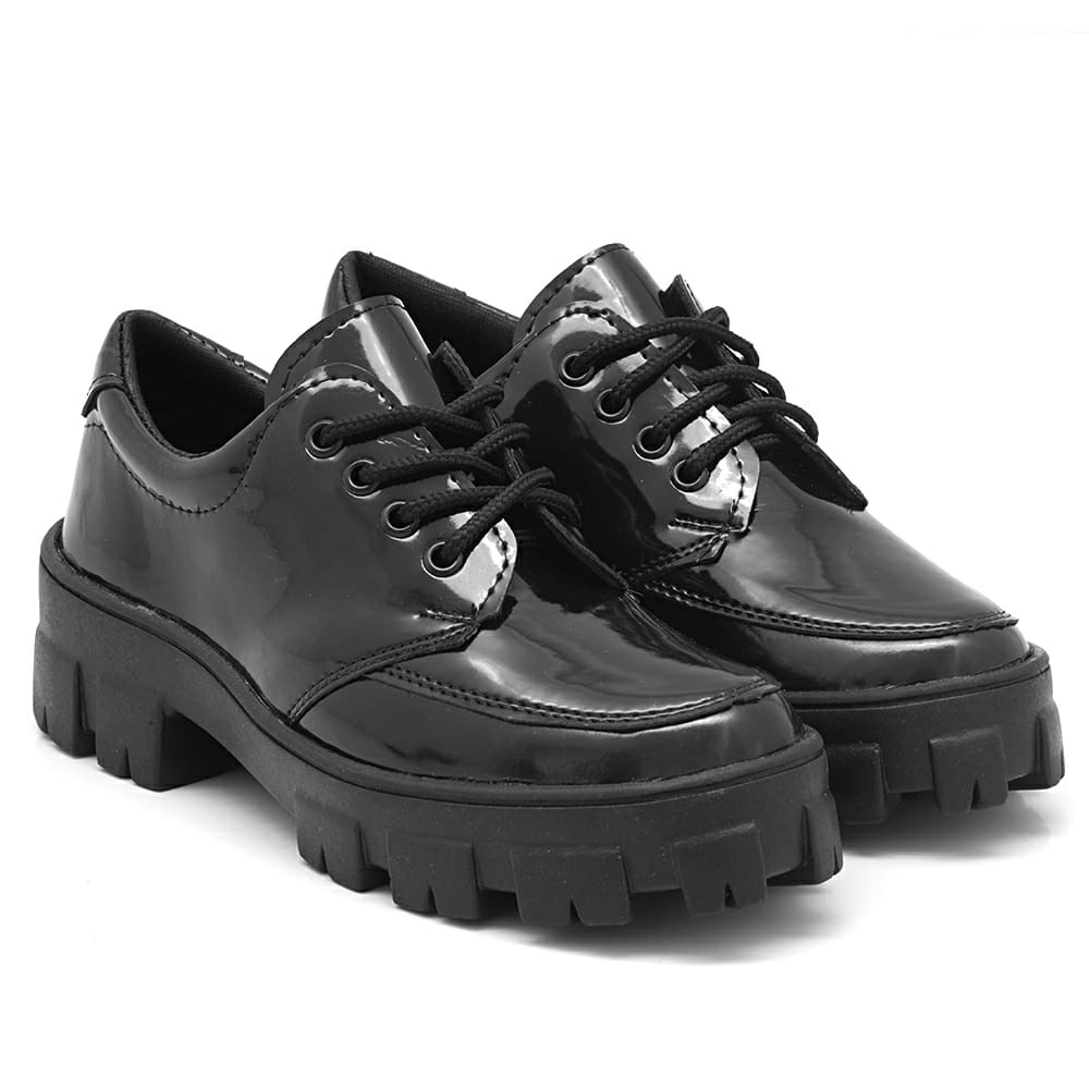 Sapato Feminino Oxford Casual Verniz Confort Tratorado Preto