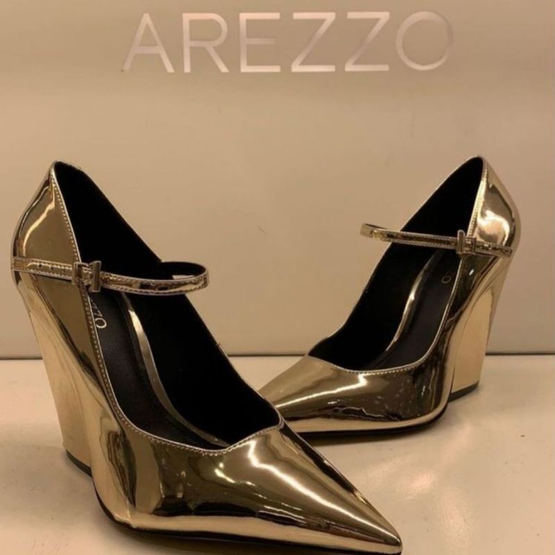 Sapato arezzo salto clearance grosso, Sapato Scarpin Arezzo Dourado Metalizado Salto Grosso Mary Jane clearance