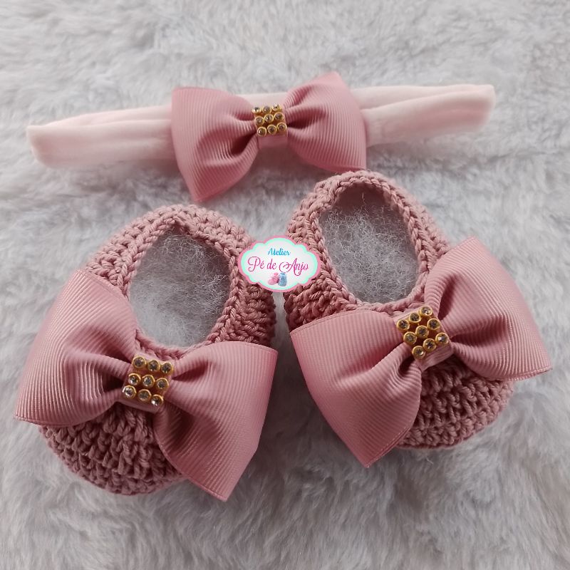 Sapatinho de croch cor Rose com Tiara detalhes em strass Sa da
