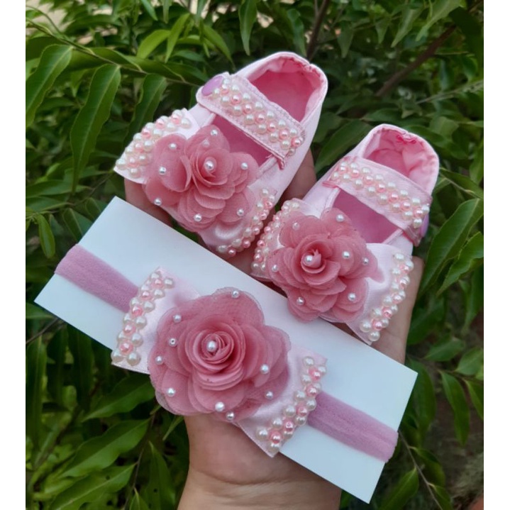 Sapatinho para beb menina com perolas kit sapato e tiara de