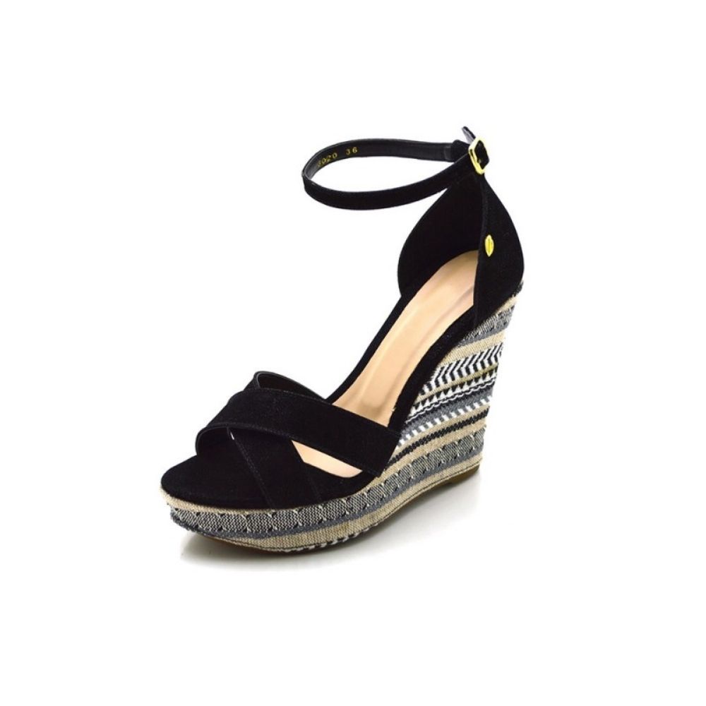 Sand lia Anabela Aberta Salto Alto Em Nobucado Preto E Salto Tecido Listrado