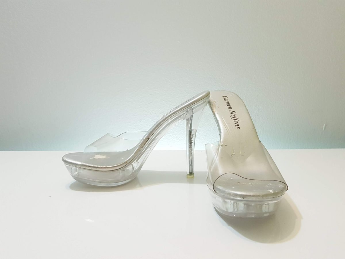 Tamanco transparente carmen clearance steffens, Tamanco Com Rebites Incolor Amarelo Salto 9cm PRIVALIA O clearance