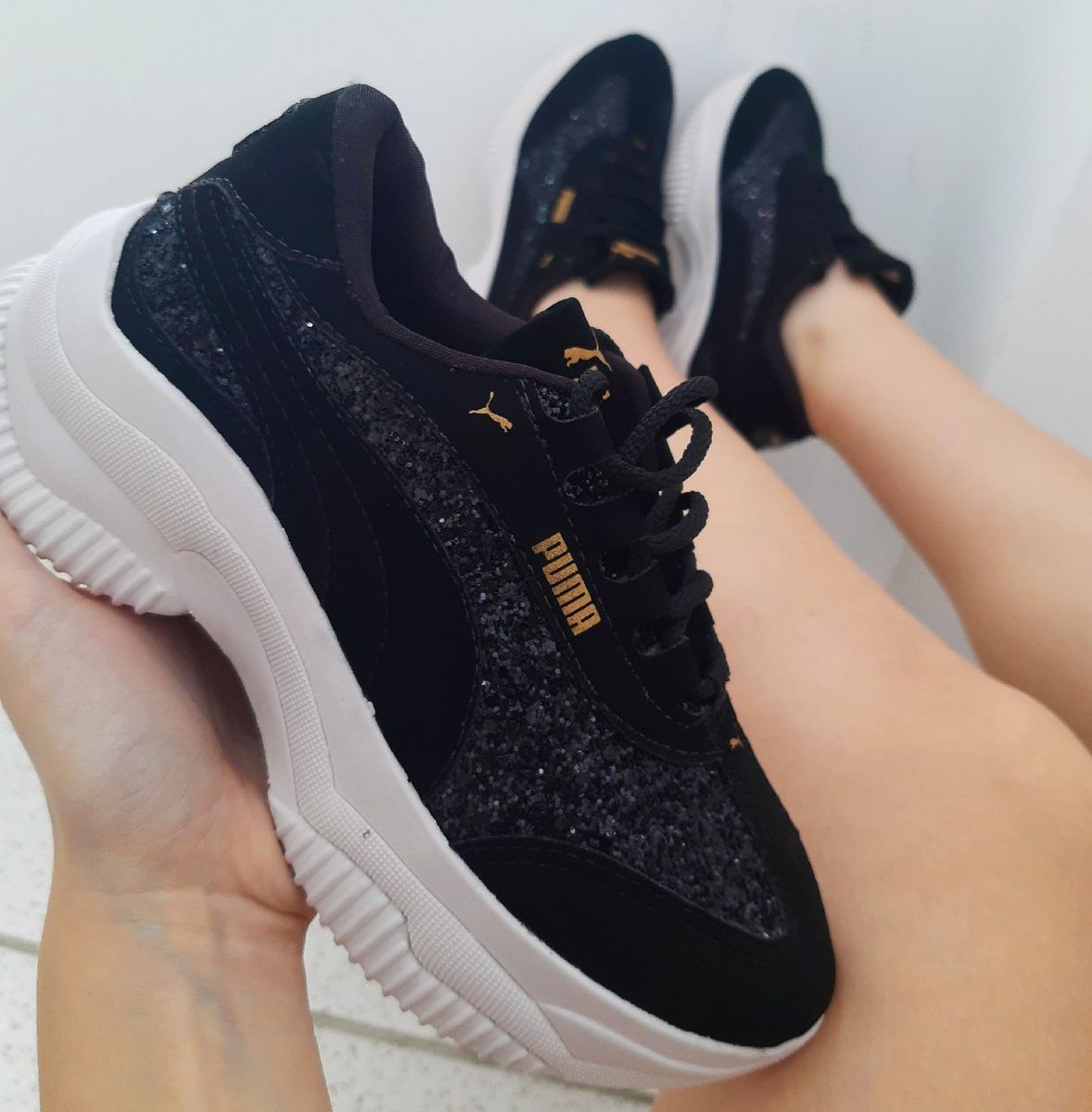 T nis Puma Femme Plataforma Preto com Glitter Loja de Cal ados