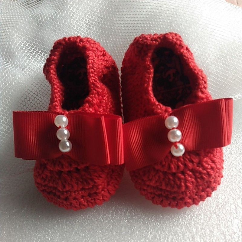 Sapatinho em croch modelo sapatilha com la o e p rolas. Tamanho 9 cm para beb s de 0 a 3 meses aproximadamente . Cor vermelha