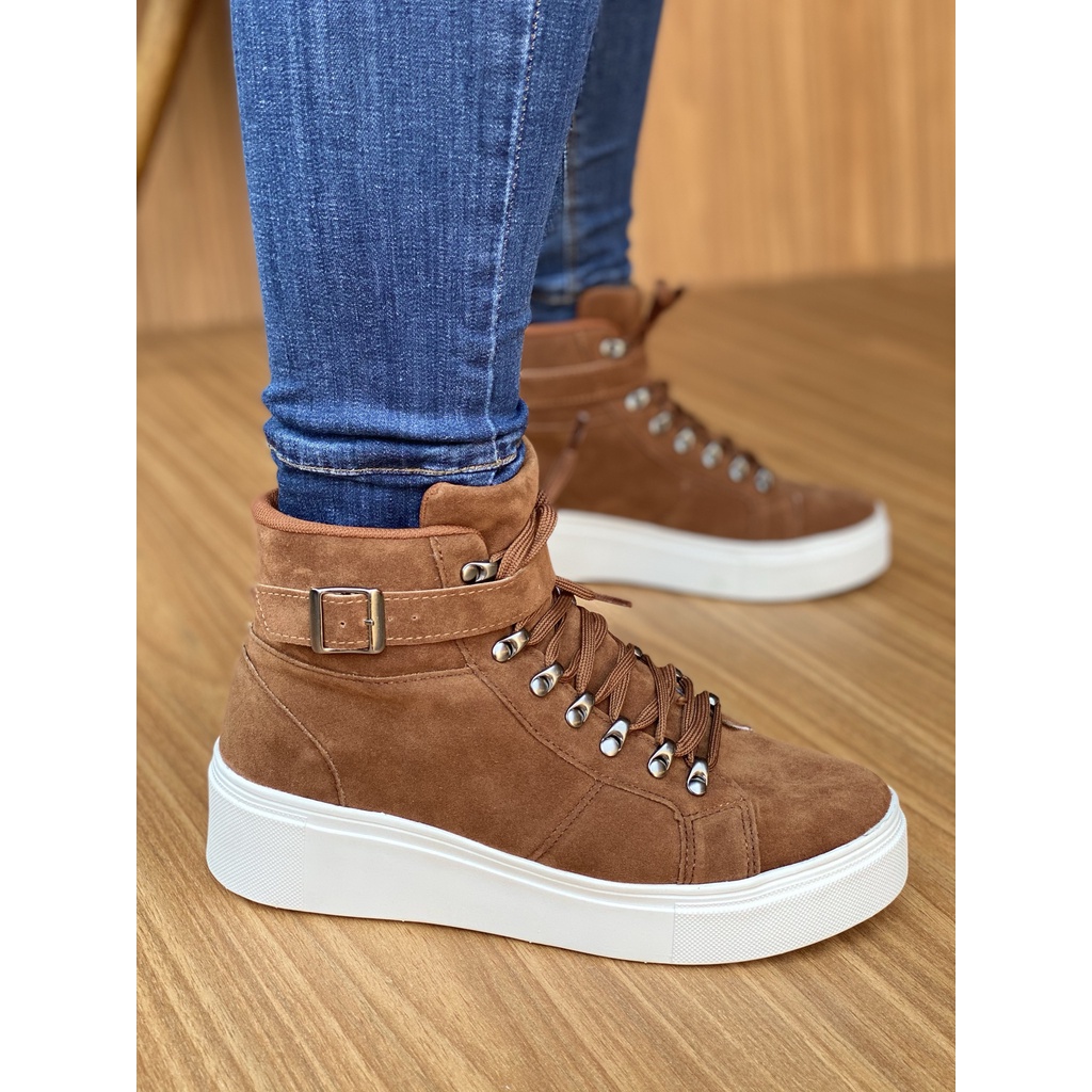 T nis Botinha Feminino Marrom Solado Alto Fivela Cano M dio