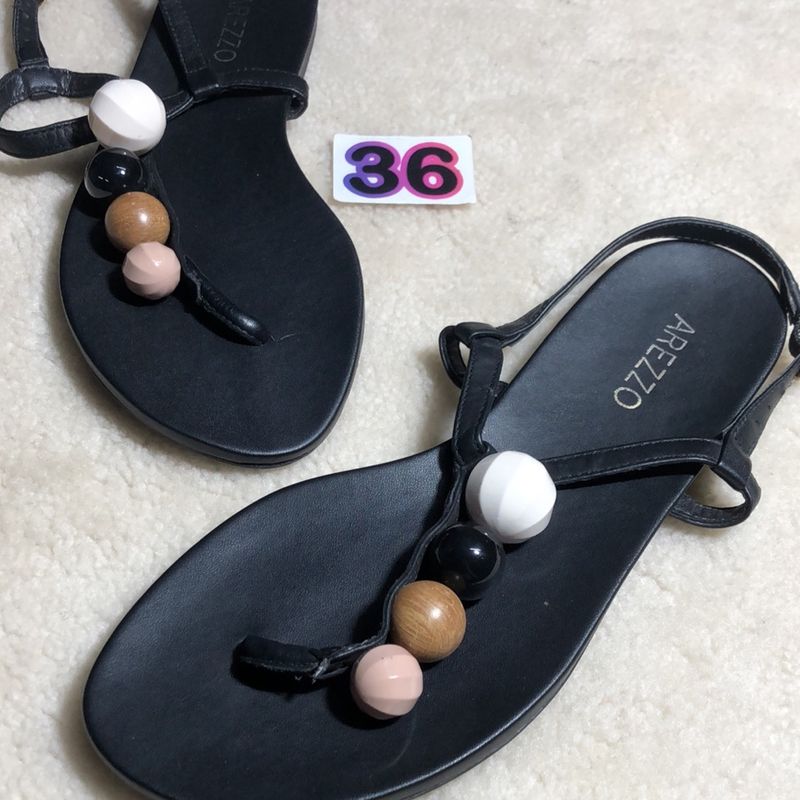 36 Rasteira Arezzo Semi Nova Preta com Aplica o de Bolas