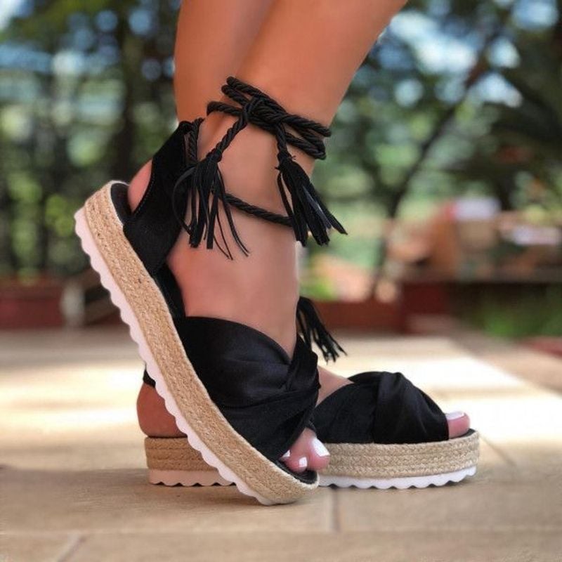 Sand lia Feminina Anabela Plataforma Preta Flatform Corda Azill
