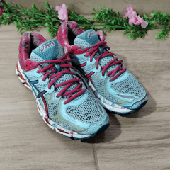 Asics kayano 21 clearance feminino, Asics Gel Kayano 21 T4H7N Blue Yellow Pink Running Shoes Lace Up clearance