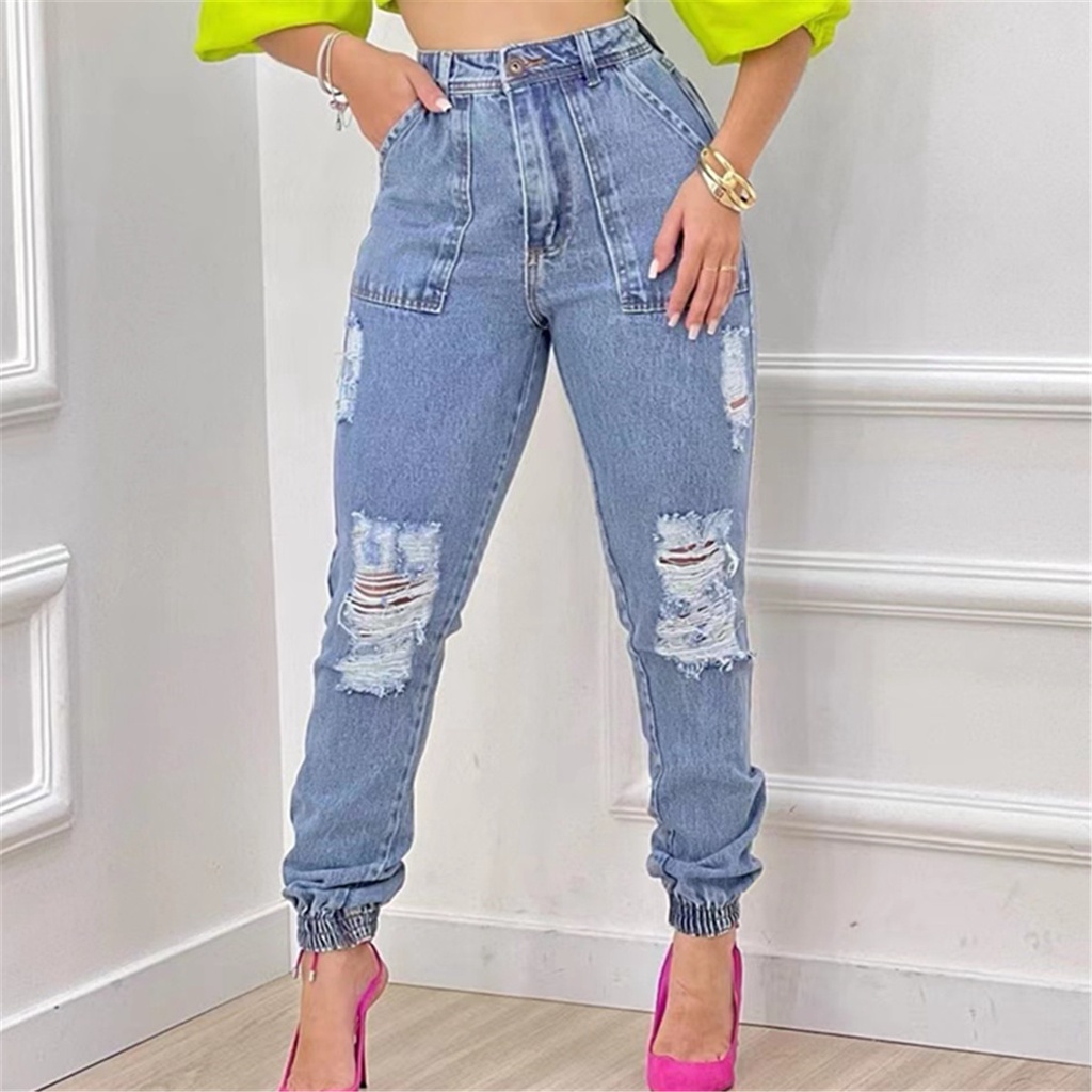 Cal a jeans feminina de cintura alta rasgada bolso de bot o
