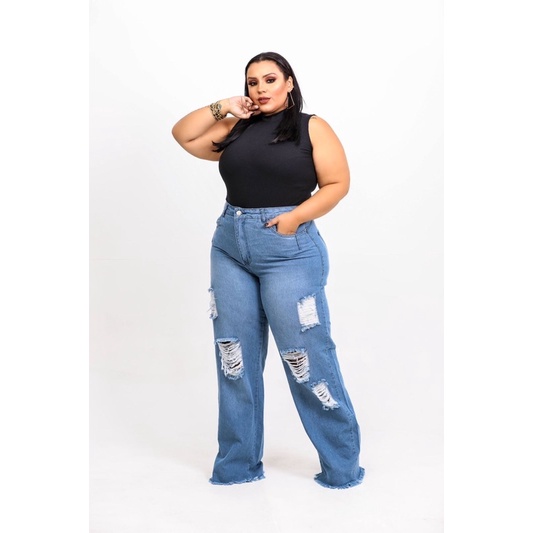 Cal a jeans Plus size Wide leg Destroyer Feminina Rasgada