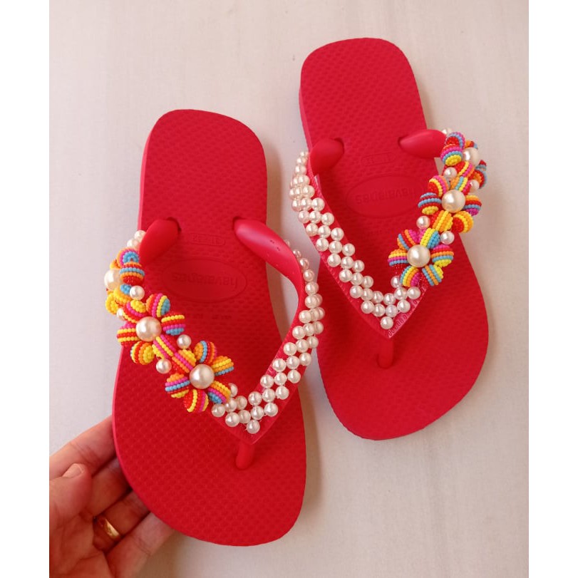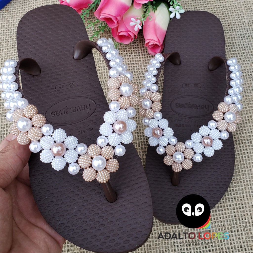 Chinelo Havaiana Decorado Flores de P rolas Craqueladas Coloridas