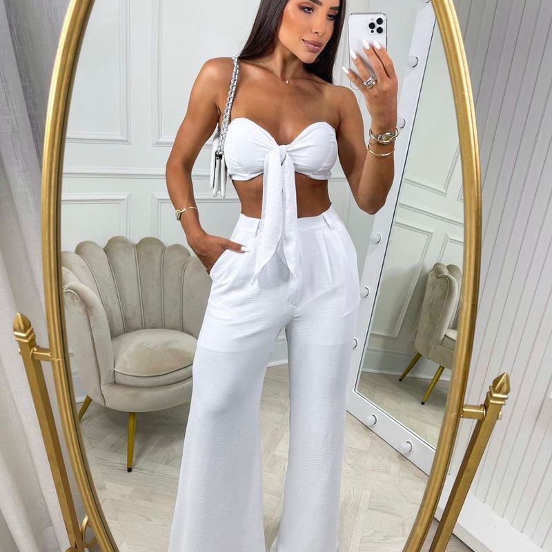 Conjunto calça pantalona clearance e cropped branco, Conjunto Cal a Pantalona e Cropped Nula Manga Bonita By Lari clearance