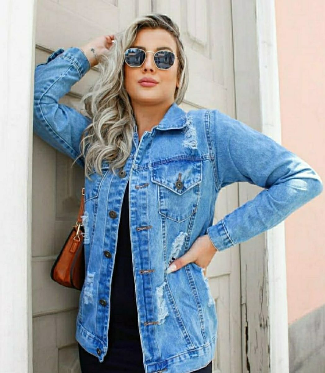 Jaqueta jeans longa clearance destroyed, Jaqueta jeans Feminina Curta Blogueira Manga longa Destroyed clearance