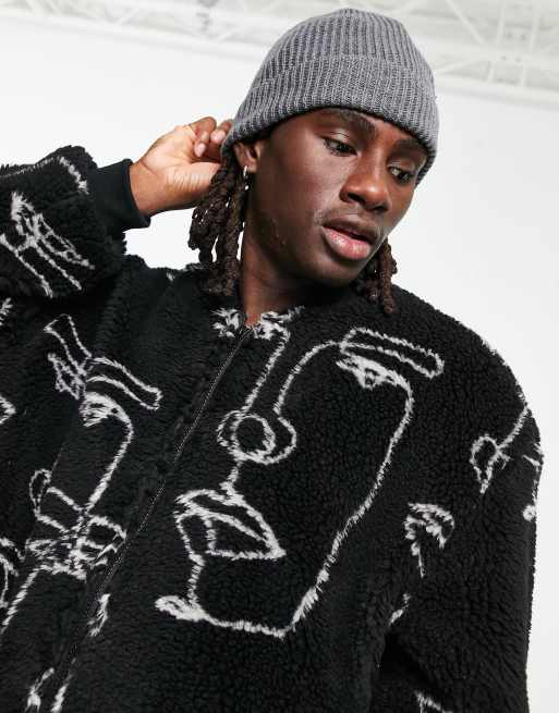 Chaqueta bomber negra con estampado delineado de caras de