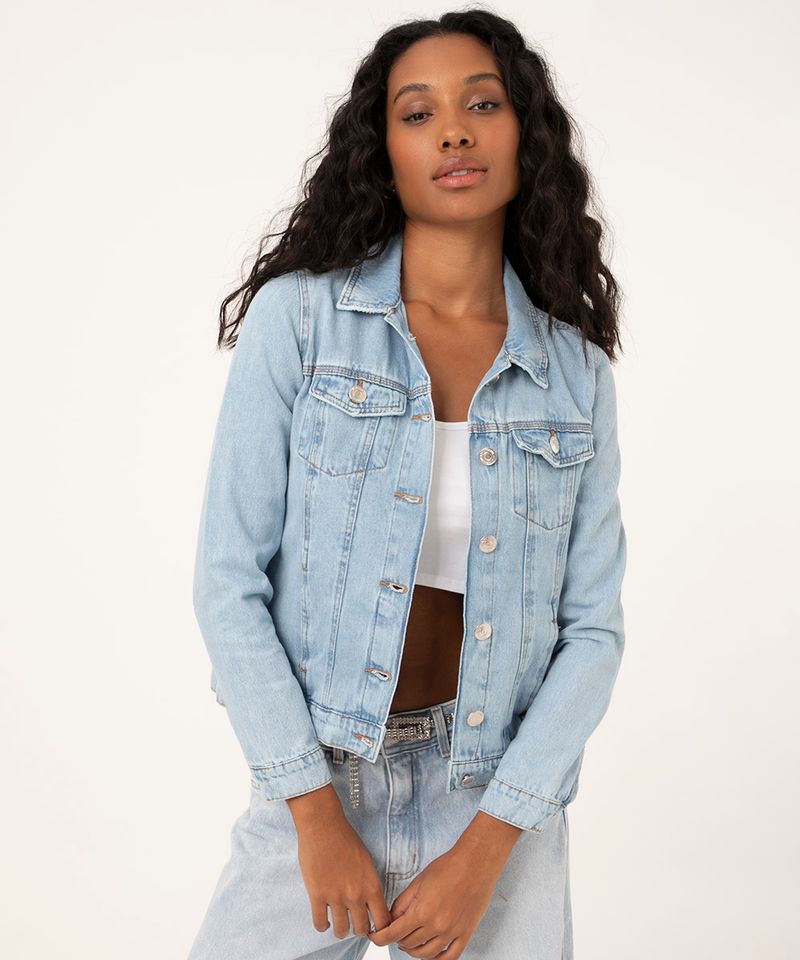 Jaqueta jeans azul clearance clara feminina, JAQUETA JEANS FEMININA BOTAO FORRADO RASGADA clearance