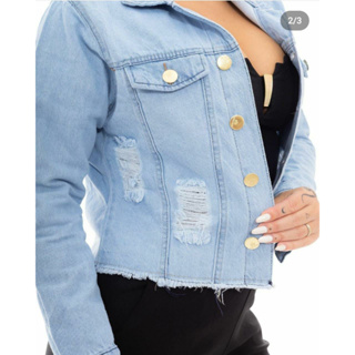 Jaqueta jeans curta clearance desfiada, Jaqueta Jeans Curta com Aplica o nas Costas Clara Dondoca Moda clearance