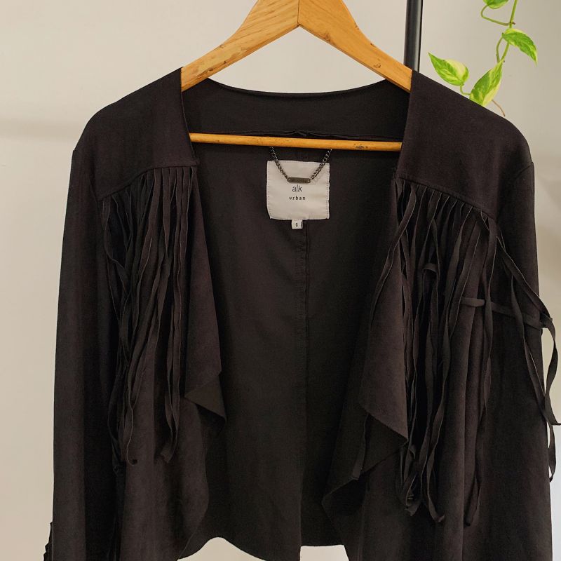 Jaqueta clearance franja riachuelo, Jaqueta Alongada em Suedine com Franja Dupla Cor Bege Tamanho clearance