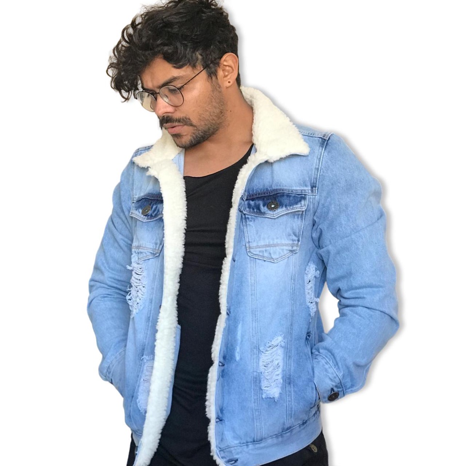 Jaqueta Jeans Masculina Trucker com Pelo Azul Claro Menor pre o