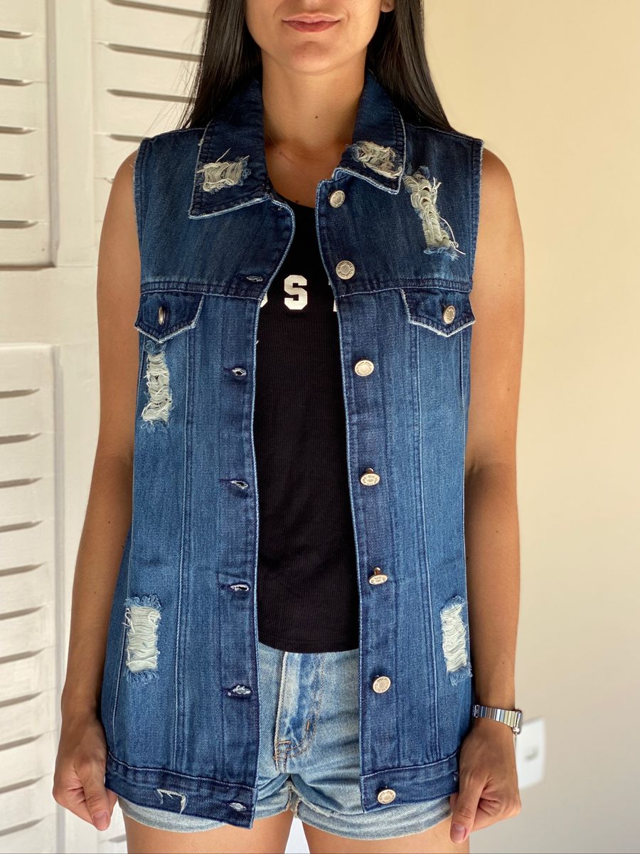 Jaqueta sem Manga Jeans Rasgada Casaco Feminino Four One Nunca
