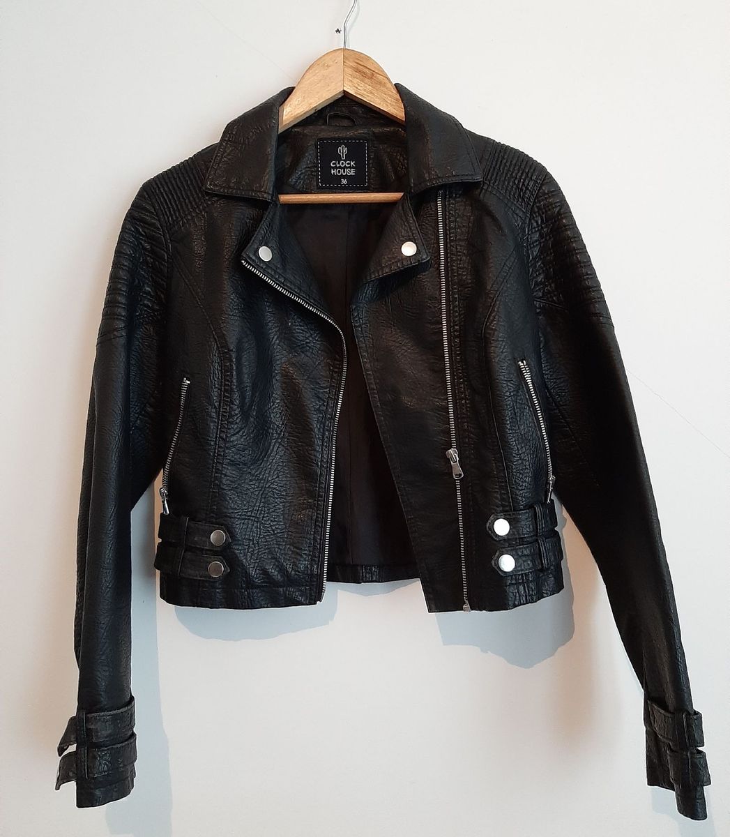Jaqueta Preta Couro Sint tico Clock House Casaco Feminino Clock