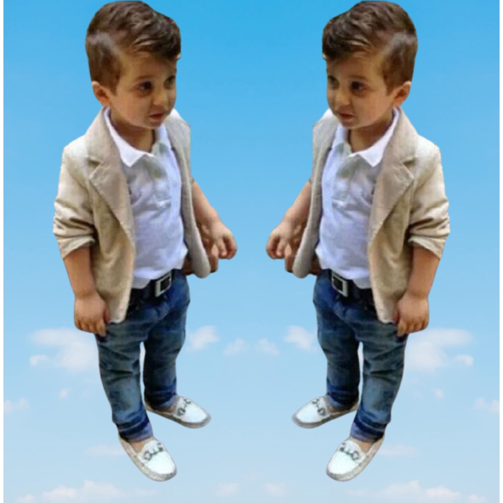 Conjunto Infantil Blazer Bege azul preto branco e Camisa modelo Polo Branca Menino