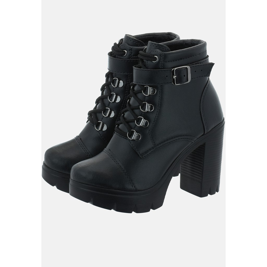 Bota Coturno Feminino Ferrile em Couro Com Fivelas e Ziper Preto Preta