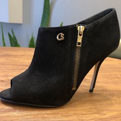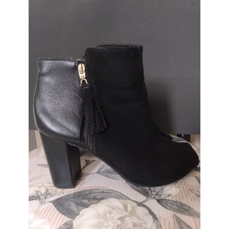 Bota feminina ankle boot frente aberta salto alto fino cano curto