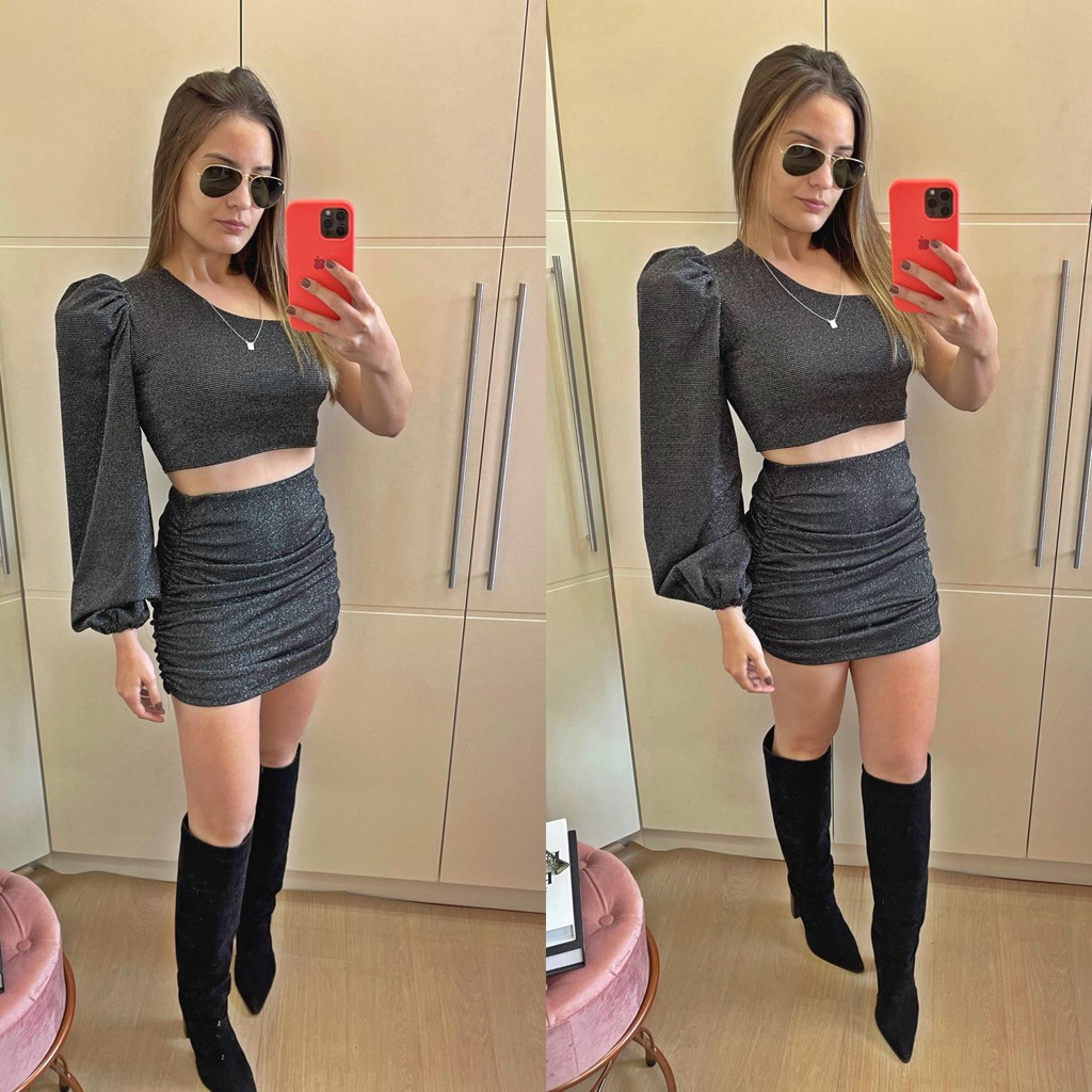 Bota com saia clearance curta, Conjunto Feminino Cropped Manga Bufante Saia Curta Brilho clearance