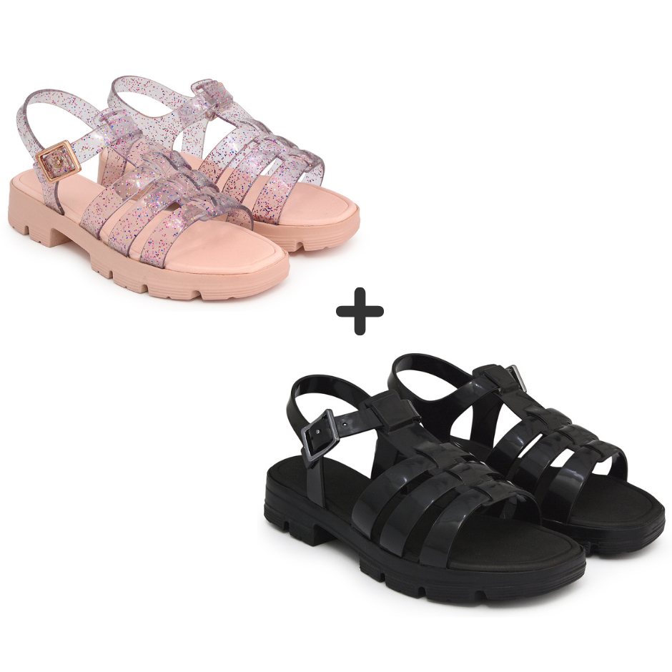 Kit Sand lia Feminina Adulta Fisherman Plataforma Tratorada Confort vel Preto e Gliter Transparente